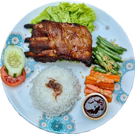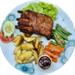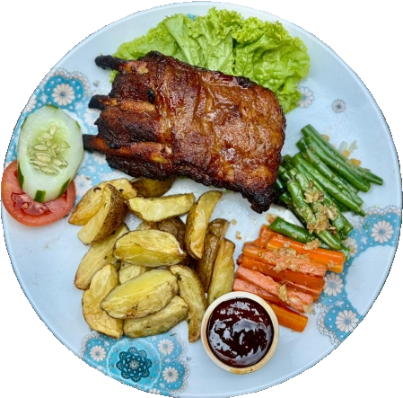 79kGrilled pork ribs with BBQ sauce, serve with rice or potatoes wedges, veggies and JJ's Kitchen sauce