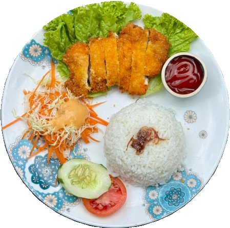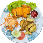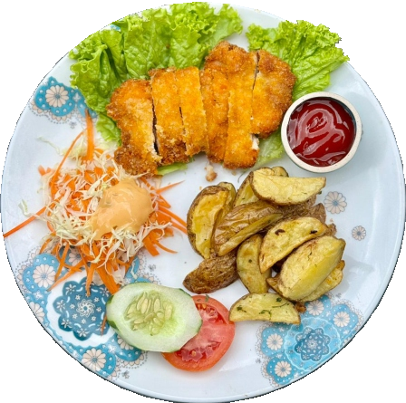 55kCrispy fried boneless chicken breast with tomato and chili sauce, serve with steam rice or potatoes wedges and salad
