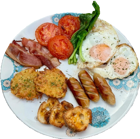 79k2 eggs any style, grill pork bacon, sausage, grill tomato, toast baguette, veggies