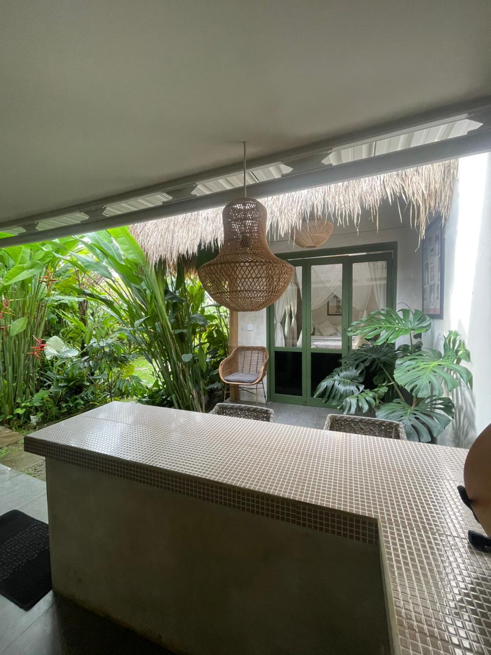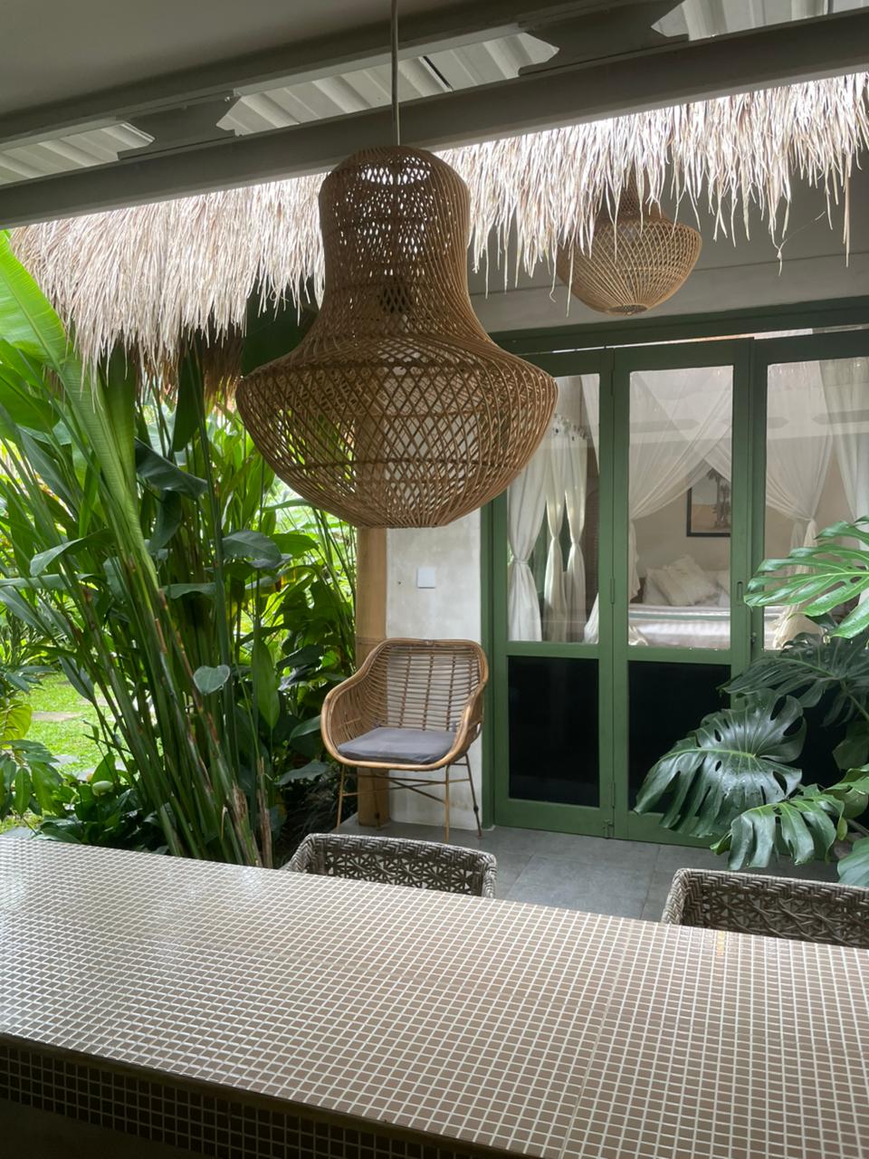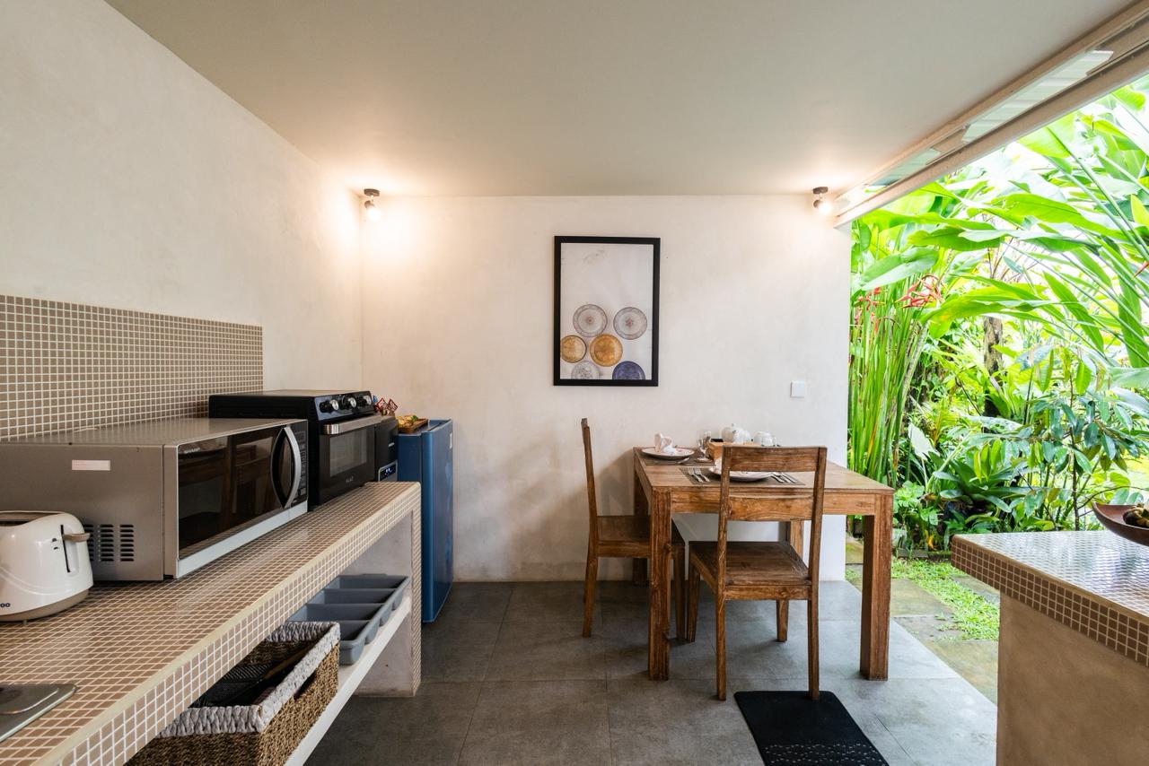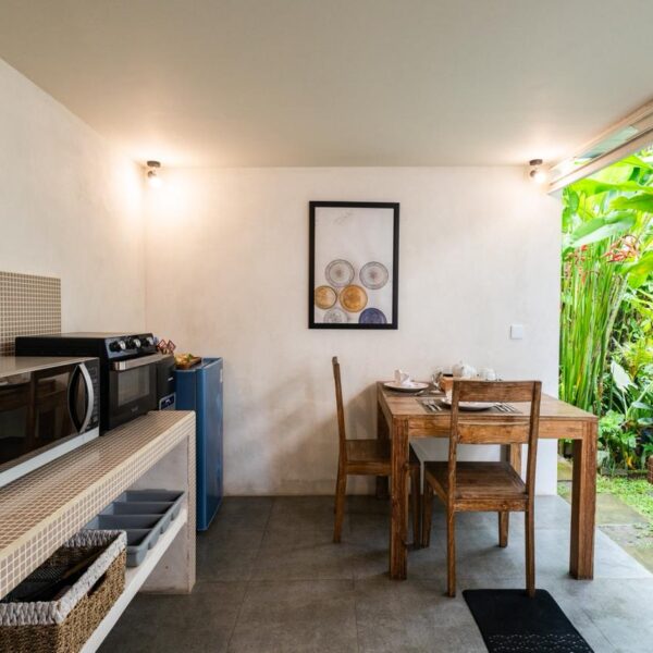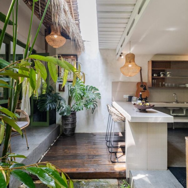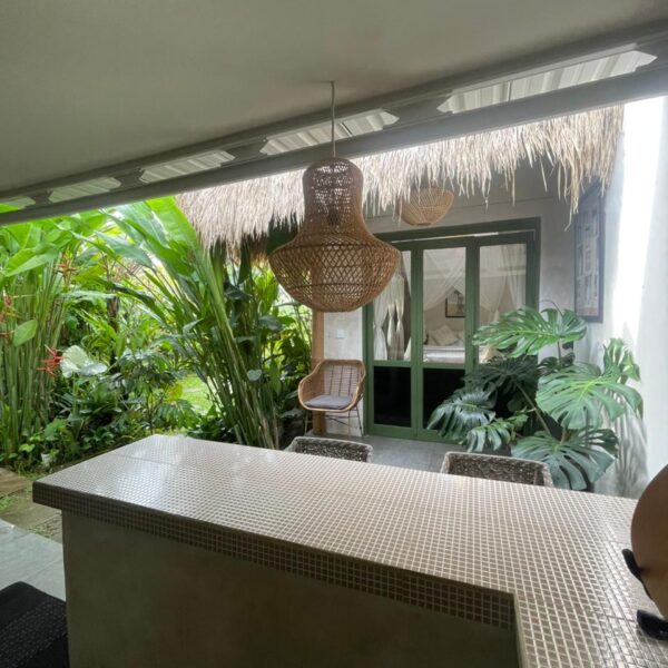 Every corner of the villa is curated for beauty. A rustic wooden dining table provides an intimate spot for morning coffee or a candlelit dinner, set against minimalist white walls adorned with colorful ceramic-inspired art. Outside, a tiled bar-top and comfortable rattan lounge chairs invite you to linger over the garden views, while large Monstera and palm leaves provide a natural screen of privacy.