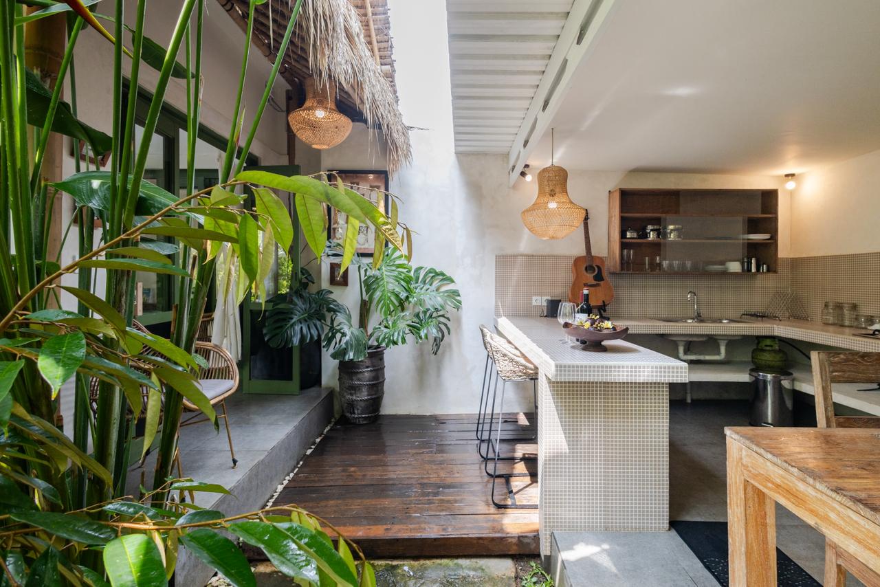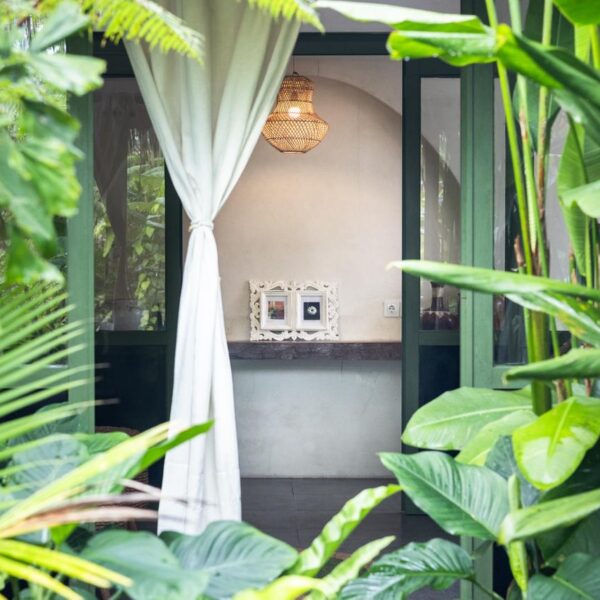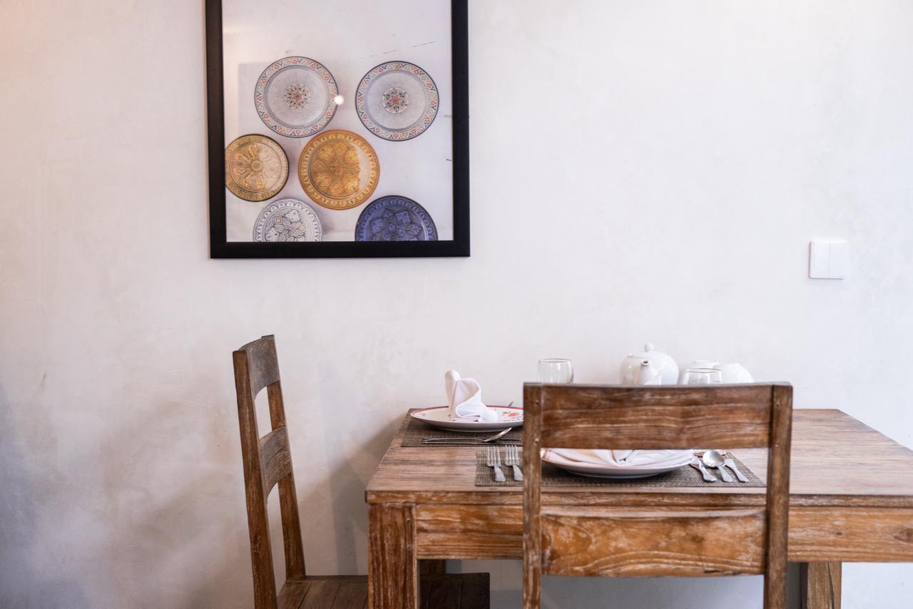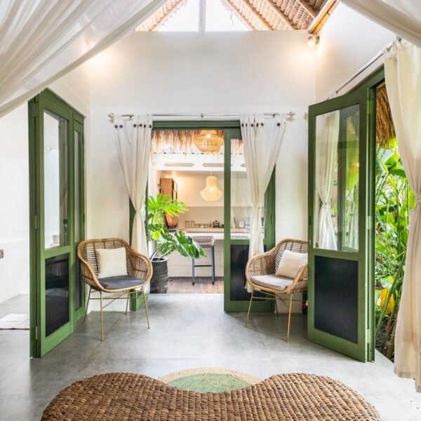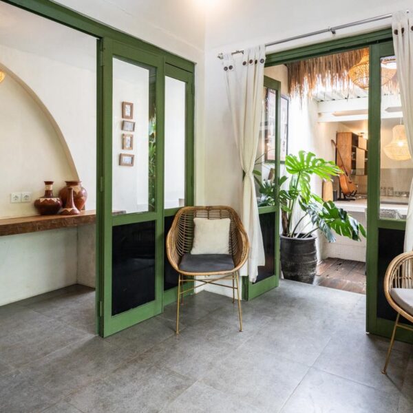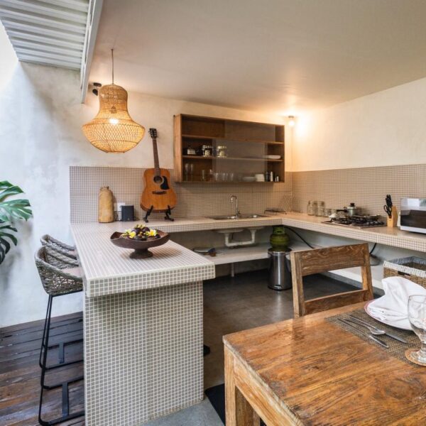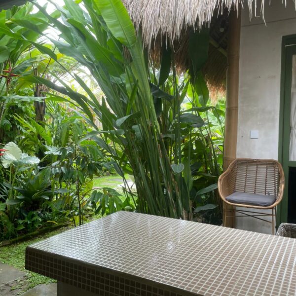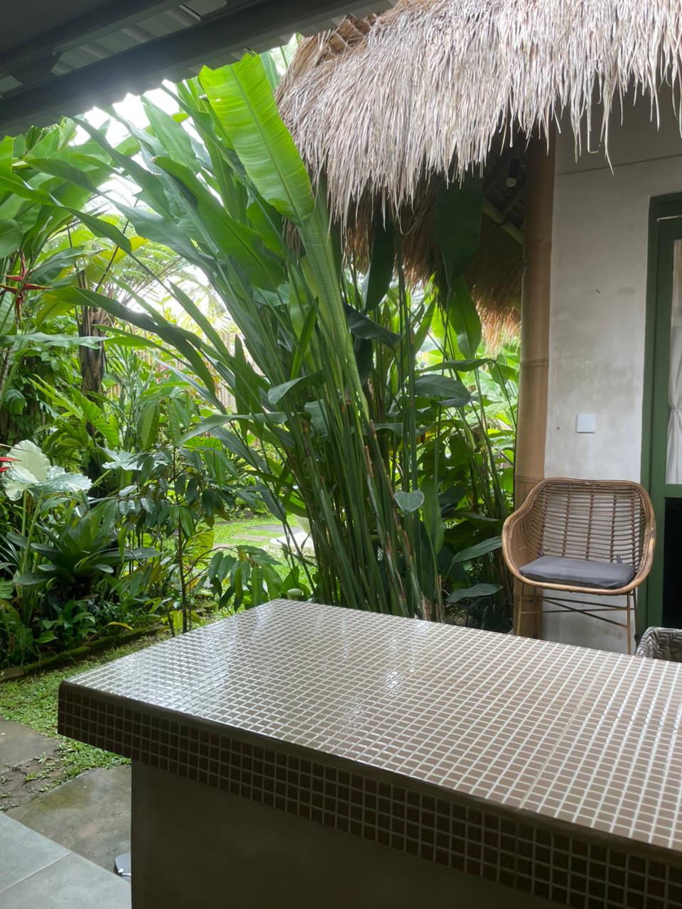 Every corner of the villa is curated for beauty. A rustic wooden dining table provides an intimate spot for morning coffee or a candlelit dinner, set against minimalist white walls adorned with colorful ceramic-inspired art. Outside, a tiled bar-top and comfortable rattan lounge chairs invite you to linger over the garden views, while large Monstera and palm leaves provide a natural screen of privacy.
