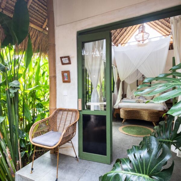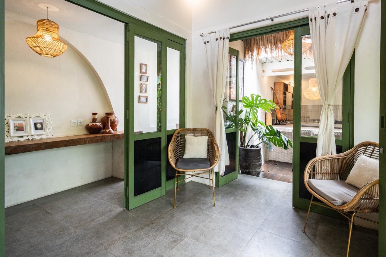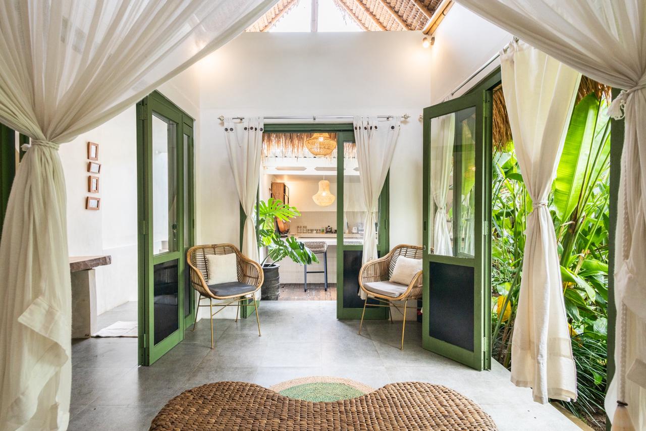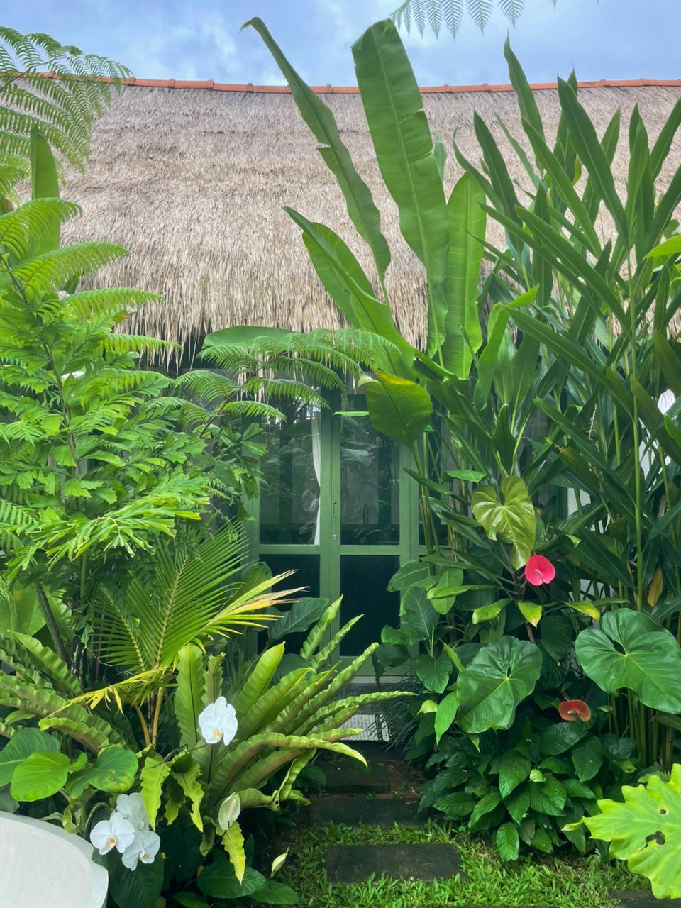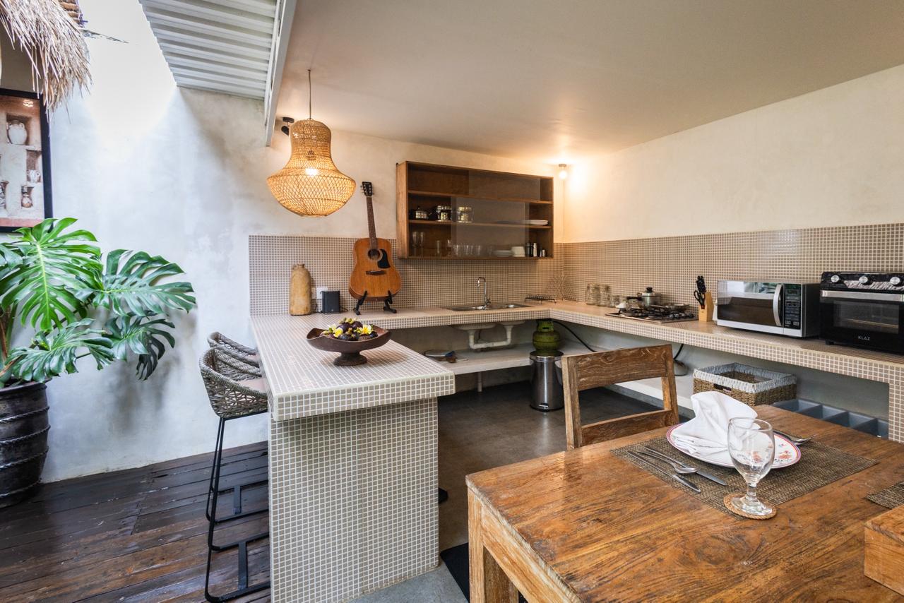 Every corner of the villa is curated for beauty. A rustic wooden dining table provides an intimate spot for morning coffee or a candlelit dinner, set against minimalist white walls adorned with colorful ceramic-inspired art. Outside, a tiled bar-top and comfortable rattan lounge chairs invite you to linger over the garden views, while large Monstera and palm leaves provide a natural screen of privacy.