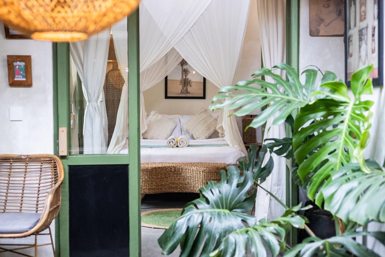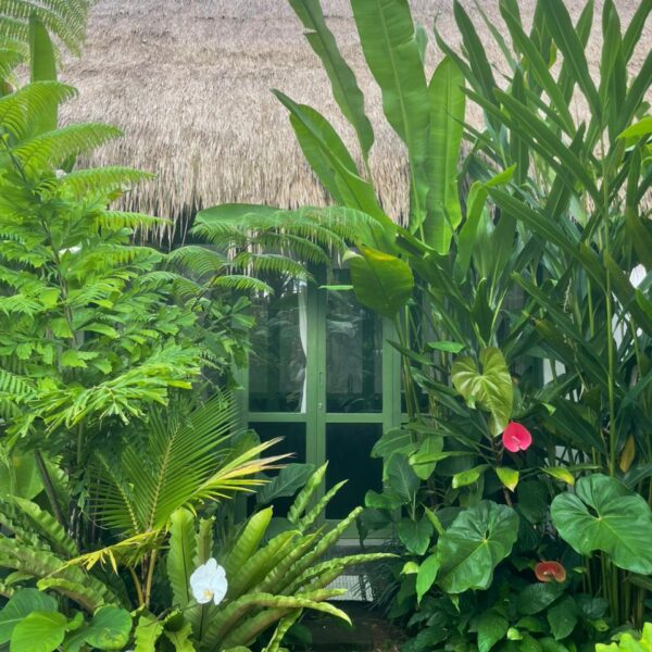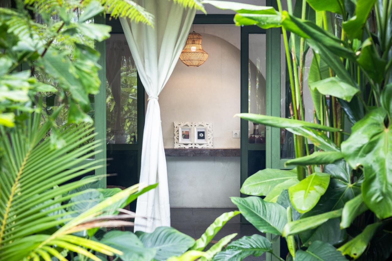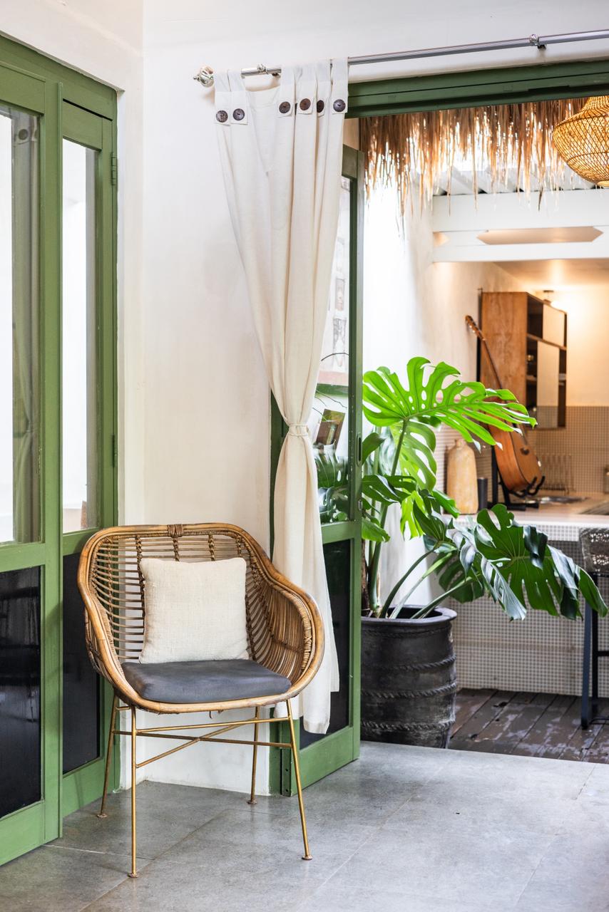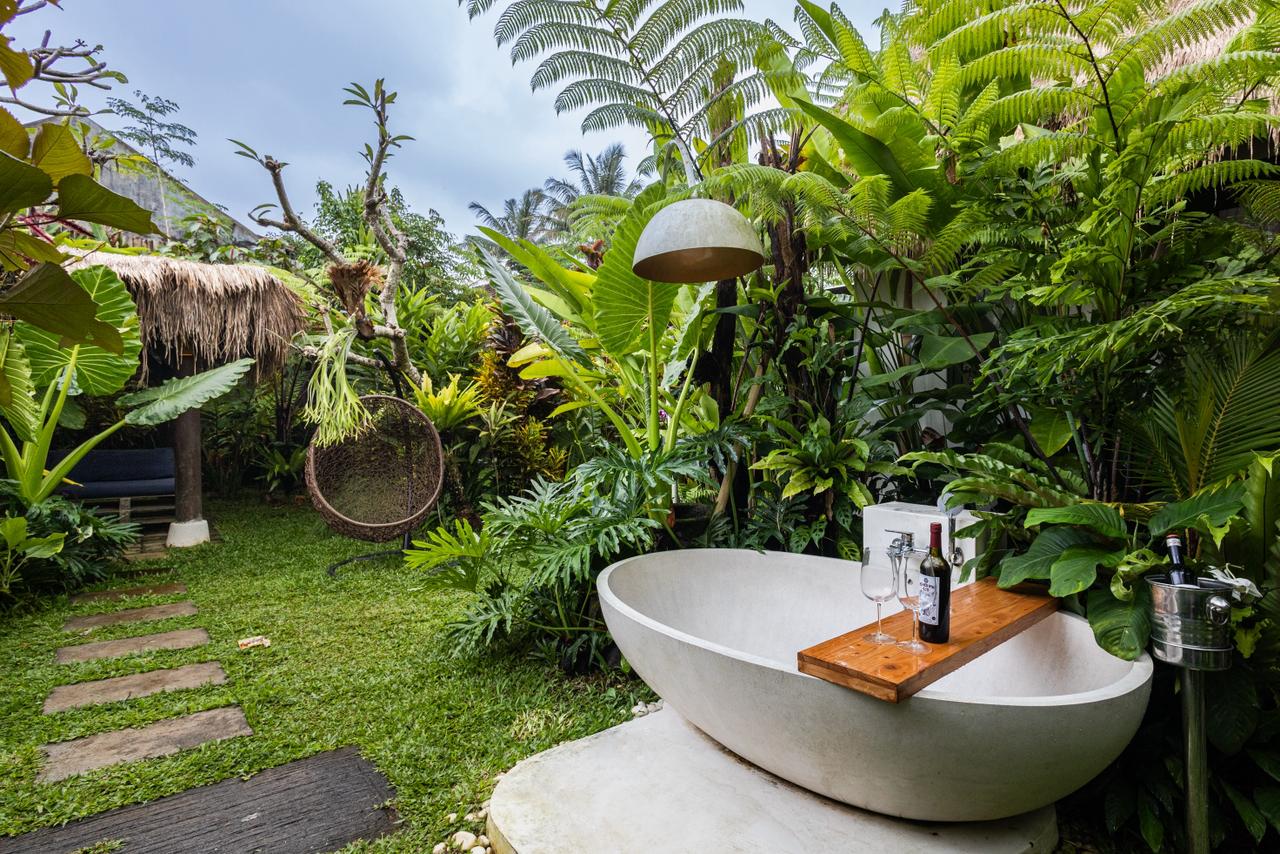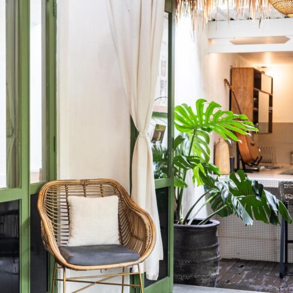 Every corner of the villa is curated for beauty. A rustic wooden dining table provides an intimate spot for morning coffee or a candlelit dinner, set against minimalist white walls adorned with colorful ceramic-inspired art. Outside, a tiled bar-top and comfortable rattan lounge chairs invite you to linger over the garden views, while large Monstera and palm leaves provide a natural screen of privacy.